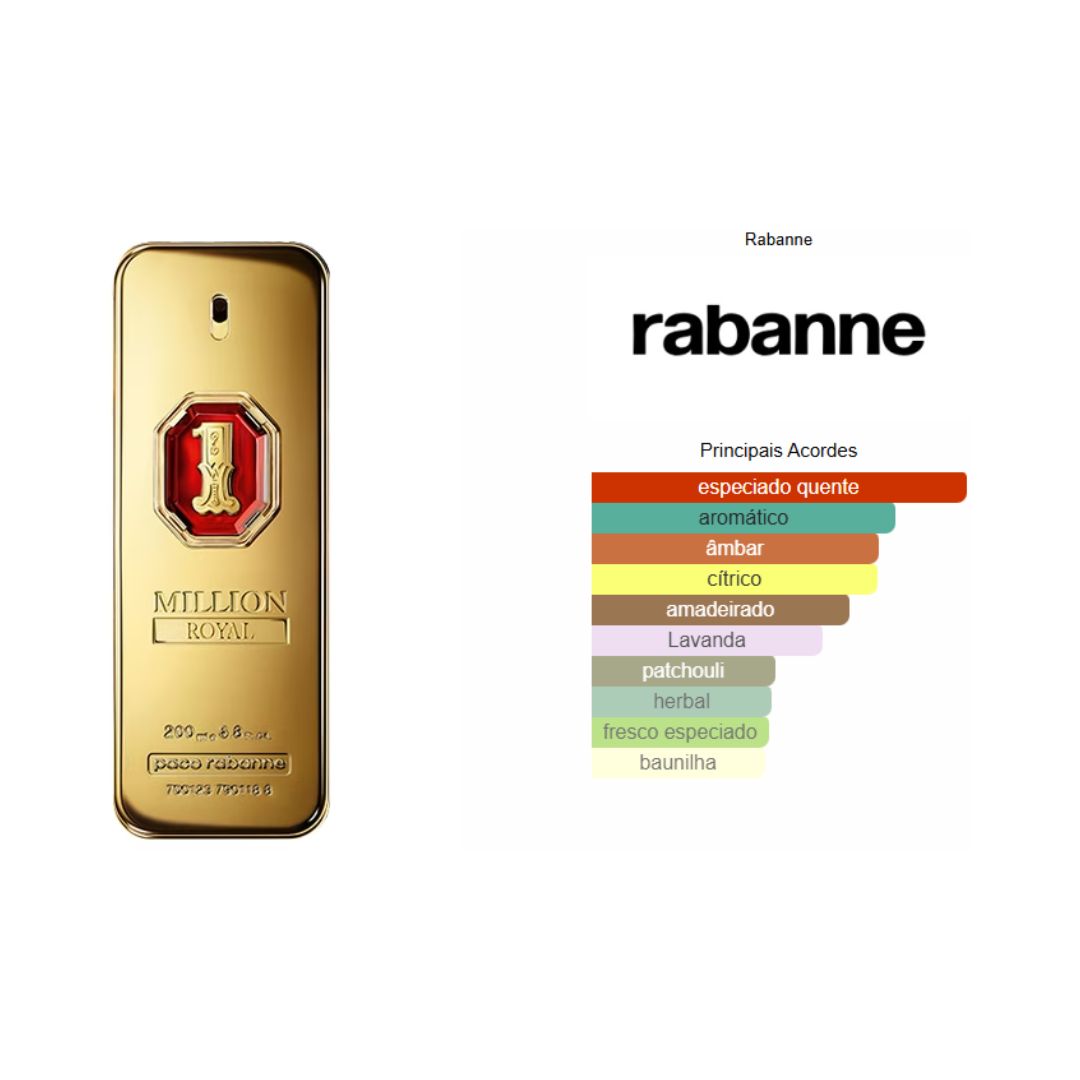 1 Million Royal de Rabanne é um perfume Oriental Amadeirado Masculino. 1 Million Royal foi lançado em 2023. 1 Million Royal foi criado por Quentin Bisch e Christophe Raynaud. As notas de topo são: Cardamomo, Tangerina e Bergamota. As notas de coração são: Lavanda, Sálvia e Folha de Violeta. As notas de fundo são: Benjoim, Cedro e Patchouli.