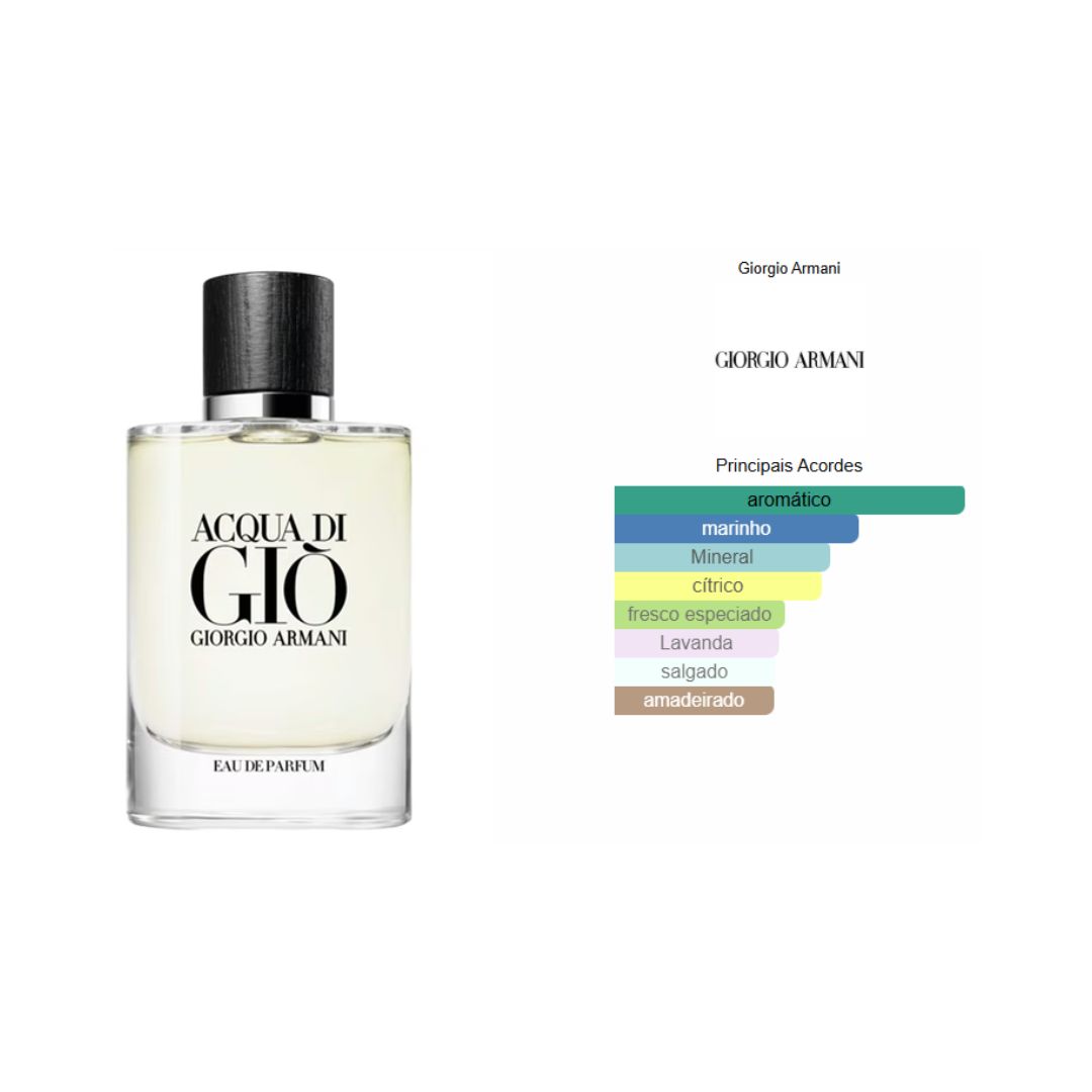 Acqua di Giò Eau de Parfum de Giorgio Armani é um perfume Aromático Aquático Masculino. Acqua di Giò Eau de Parfum foi lançado em 2022. O perfumista que assina esta fragrância é Alberto Morillas. As notas de topo são: Notas Oceânicas e Mandarina Verde. As notas de coração são: Sálvia Esclaréia, Lavanda e Gerânio. As notas de fundo são: Notas Minerais, Vetiver e Patchouli.