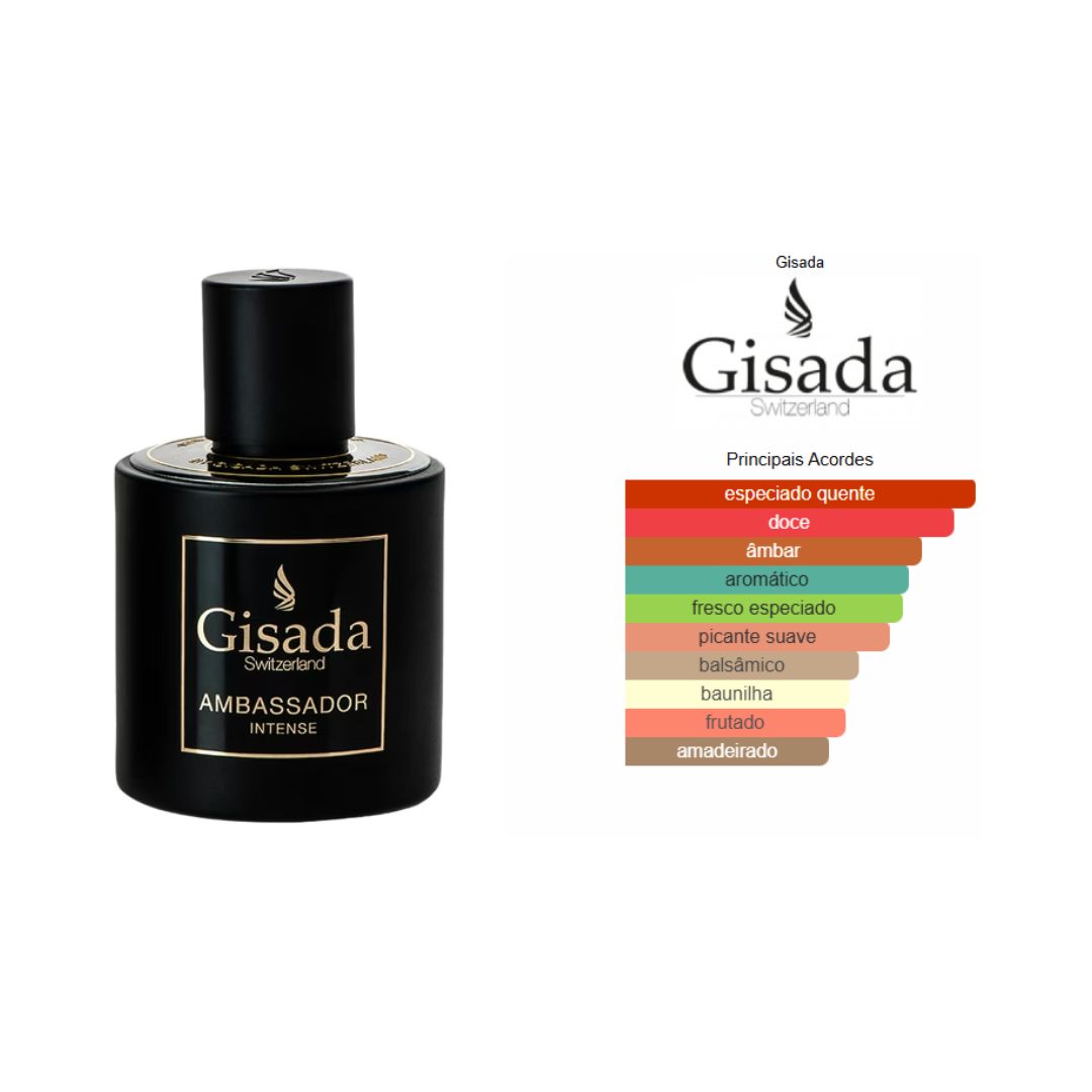 Ambassador Intense de Gisada é um perfume Masculino. Ambassador Intense foi lançado em 2022. O perfumista que assina esta fragrância é Olaf Larsen. As notas de topo são: Alcaçuz, Cardamomo da Guatemala, Noz-moscada, Lavanda, Incenso, Pimenta Rosa, Elemi, Gengibre, Bergamota, Mandarina e Notas Ozônicas. As notas de coração são: Framboesa, Caramelo, Canela, Cravo-da-Índia, Gerânio, Jasmim, Orquídea, Heliotrópio e Frésia. As notas de fundo são: Fava Tonka, Baunilha, Âmbar, Patchouli, Madeira de Cashmere, Couro, Vetiver do Haiti, Almíscar, Ládano e Musgo de Carvalho.