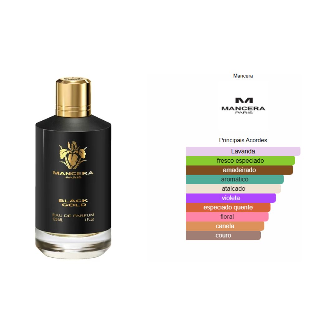 Black Gold de Mancera é um perfume Couro Aromático Masculino. Black Gold foi lançado em 2017. O perfumista que assina esta fragrância é Pierre Montale. As notas de topo são: Lavanda, Canela, Noz-moscada, Cítricos e Agarwood (Oud). As notas de coração são: Violeta, Jasmim, Folha de Patchouli, Rosa e Notas Oceânicas. As notas de fundo são: Couro, Notas Amadeiradas, Almíscar Branco, Âmbar e Vetiver.