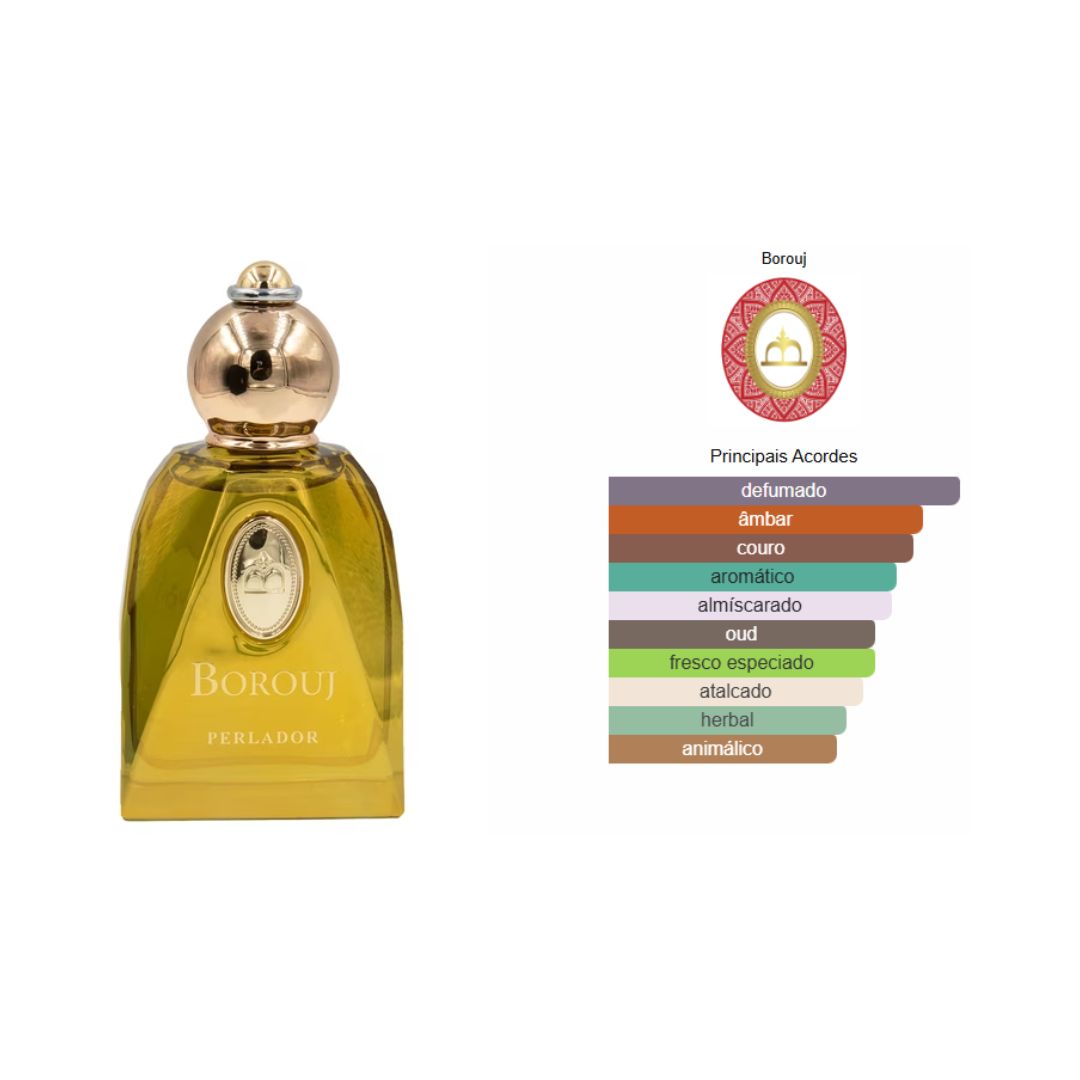 Perlador de Borouj é um perfume Couro Compartilhável. Perlador foi lançado em 2020. As notas de topo são: Manjericão e Sálvia. As notas de coração são: Incenso e Violeta. As notas de fundo são: Couro, Agarwood (Oud) e Almíscar Cinza.