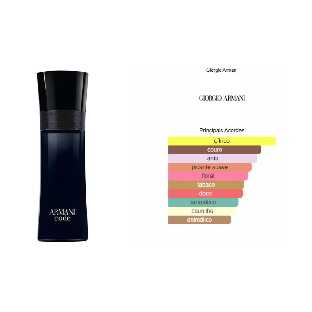 Armani Code de Giorgio Armani é um perfume Oriental Especiado Masculino. Armani Code foi lançado em 2004. O perfumista que assina esta fragrância é Antoine Lie. As notas de topo são: Limão e Bergamota. As notas de coração são: Anis Estrelado, Flor de Oliveira e Madeira Guaiac. As notas de fundo são: Couro, Fava Tonka e Tabaco. Este perfume é o vencedor do prêmio FiFi Award Fragrance Of The Year Men`s Luxe 2006.