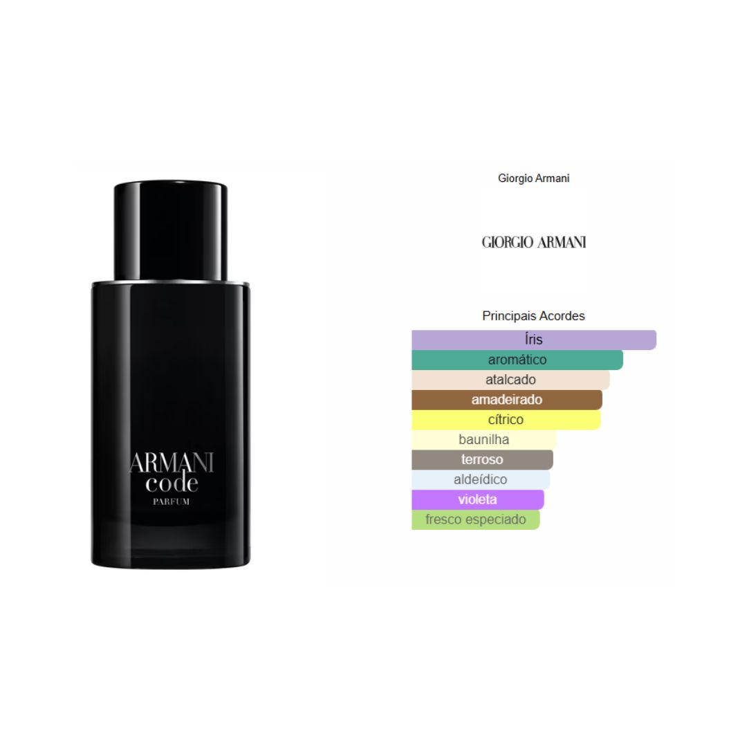 Armani Code Parfum de Giorgio Armani é um perfume Amadeirado Aromático Masculino. Armani Code Parfum foi lançado em 2022. O perfumista que assina esta fragrância é Antoine Maisondieu. As notas de topo são: Bergamota e Folha de Bergamota. As notas de coração são: Íris, Aldeídos, Sálvia Esclaréia e Raíz de Orris. As notas de fundo são: Fava Tonka e Cedro.
