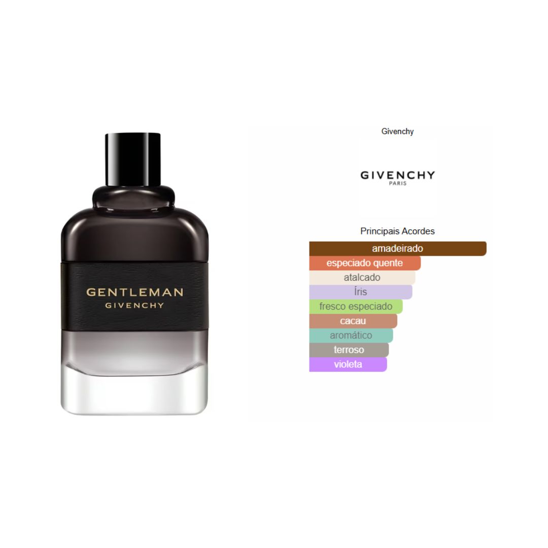 Gentleman Eau de Parfum Boisée de Givenchy é um perfume Amadeirado Especiado Masculino. Gentleman Eau de Parfum Boisée foi lançado em 2020. O perfumista que assina esta fragrância é Olivier Cresp. As notas de topo são: Pimenta Preta, Gerânio e Coentro. As notas de coração são: Íris, Semente de Cacau e Cedro. As notas de fundo são: Notas Amadeiradas, Sândalo e Patchouli.