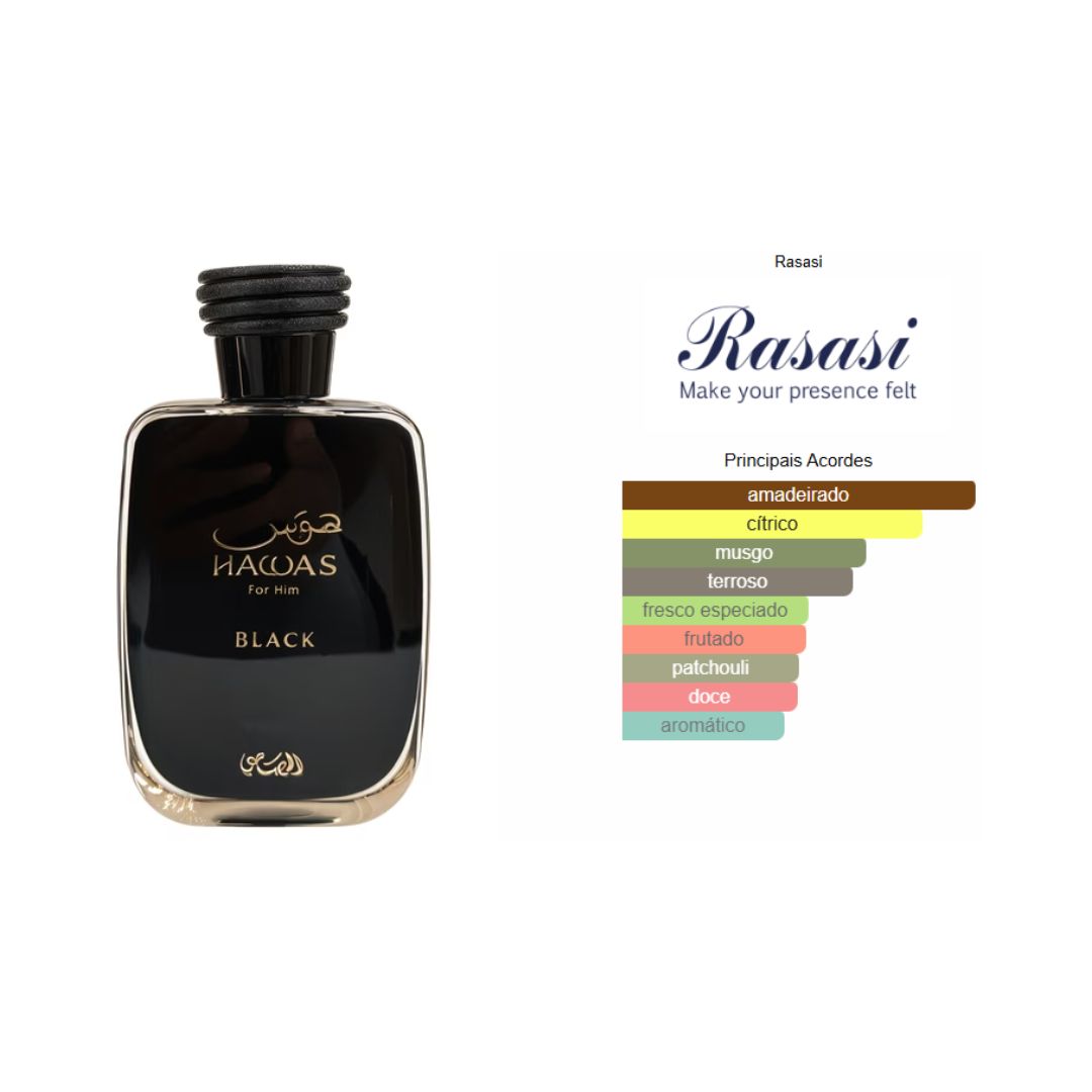 Hawas Black de Rasasi é um perfume Aromático Frutado Masculino. Esta é uma nova fragrância. Hawas Black foi lançado em 2024. As notas de topo são: Bergamota, Abacaxi e Toranja. As notas de coração são: Patchouli, Cedro e Jasmim. As notas de fundo são: Musgo de Carvalho, Notas Amadeiradas e Âmbar.