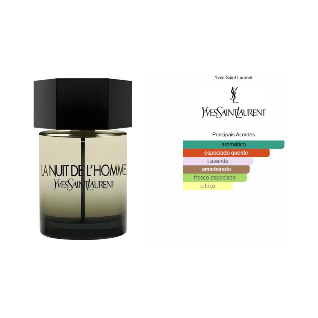 La Nuit de l’Homme de Yves Saint Laurent é um perfume Amadeirado Especiado Masculino. La Nuit de l’Homme foi lançado em 2009. La Nuit de l’Homme foi criado por Anne Flipo, Pierre Wargnye e Dominique Ropion. A nota de topo é: Cardamomo. As notas de coração são: Lavanda, Cedro da Virgínia e Bergamota. As notas de fundo são: Vetiver e Alcarávia.