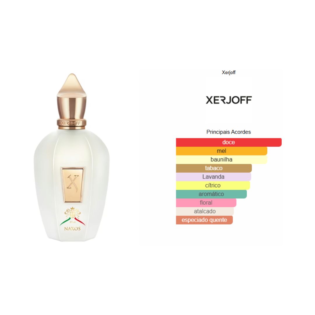 XJ 1861 Naxos de Xerjoff é um perfume Cítrico Gourmet Compartilhável. XJ 1861 Naxos foi lançado em 2015. As notas de topo são: Lavanda, Bergamota e Limão. As notas de coração são: Mel, Canela, Cashmeran e Jasmim Sambac. As notas de fundo são: Folha de Tabaco, Baunilha e Fava Tonka.