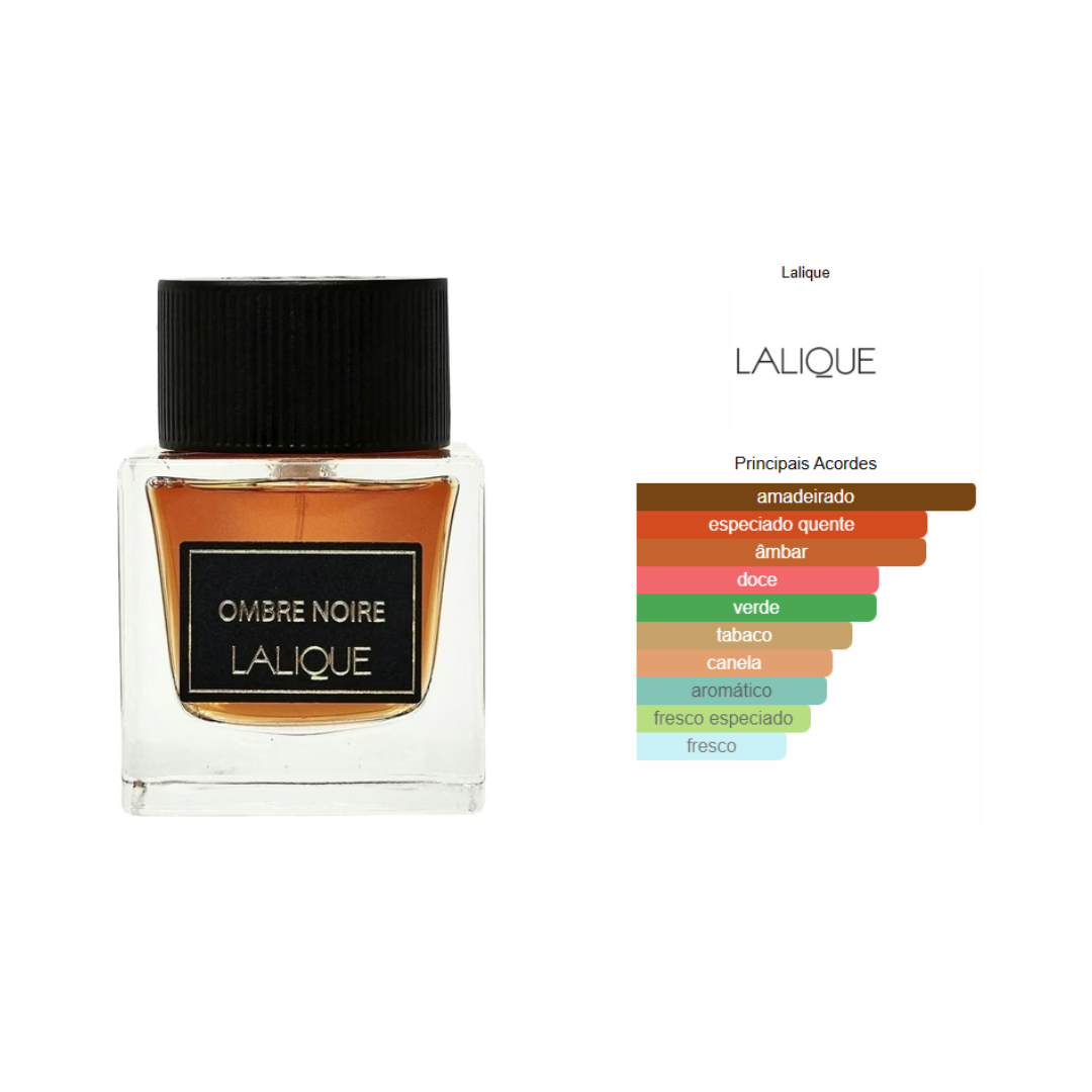 Ombre Noire de Lalique é um perfume Oriental Especiado Masculino. Ombre Noire foi lançado em 2017. O perfumista que assina esta fragrância é Karine Dubreuil-Sereni. As notas de topo são: Folha de Figo, Hortelã e Bergamota. As notas de coração são: Folha de Tabaco, Canela e Papiro. As notas de fundo são: Conhaque, Mirra, Olíbano, Cedro e Fava Tonka.