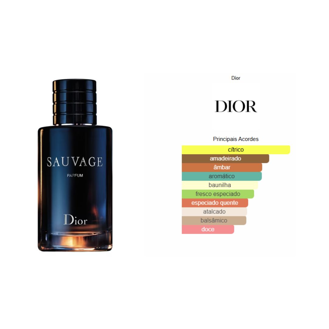Sauvage de Dior é um perfume Aromático Fougére Masculino. Sauvage foi lançado em 2015. O perfumista que assina esta fragrância é François Demachy. As notas de topo são: Bergamota da Calábria e Pimenta. As notas de coração são: Pimenta de Szechuan, Lavanda, Pimenta Rosa, Vetiver, Patchouli, Gerânio e Elemi. As notas de fundo são: Ambroxan, Cedro e Ládano.