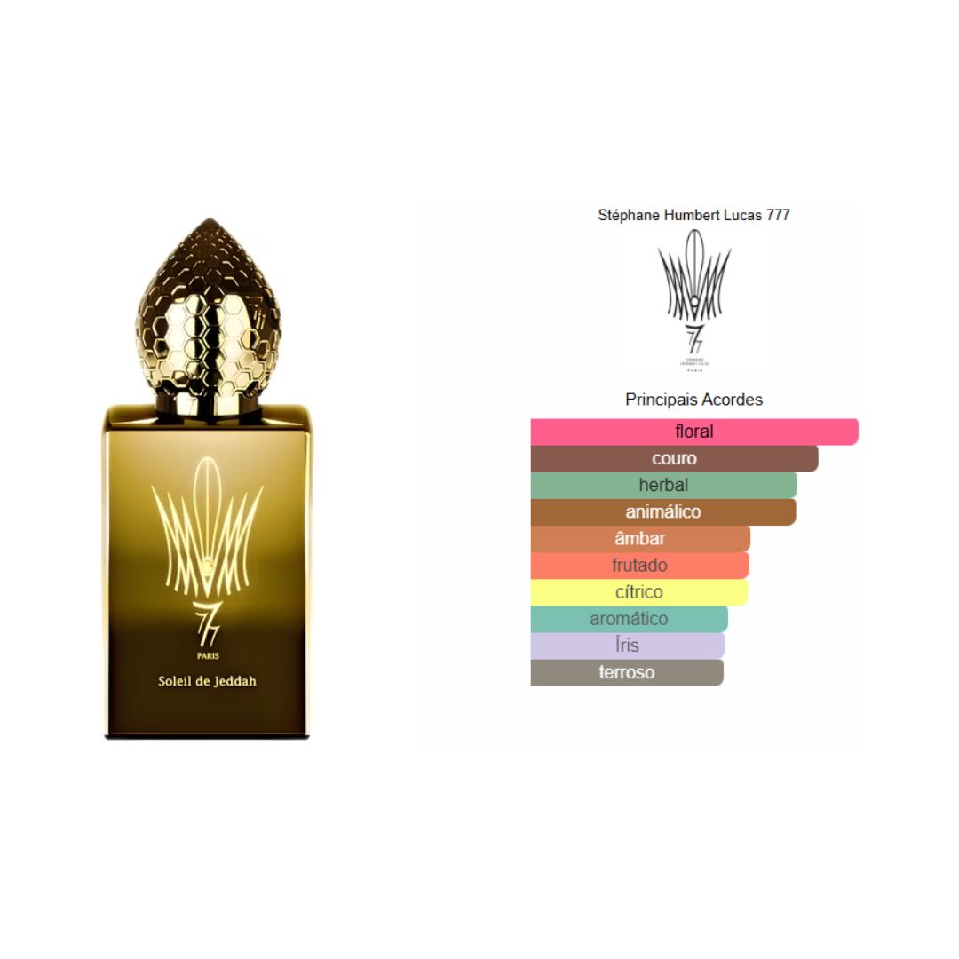 Soleil de Jeddah de Stéphane Humbert Lucas 777 é um perfume Oriental Compartilhável. Soleil de Jeddah foi lançado em 2013. O perfumista que assina esta fragrância é Stéphane Humbert Lucas. As notas de topo são: Camomila, Osmanthus e Limão. As notas de coração são: Âmbar Cinzento, Íris e Notas Terrosas. As notas de fundo são: Couro, Íris e Baunilha.